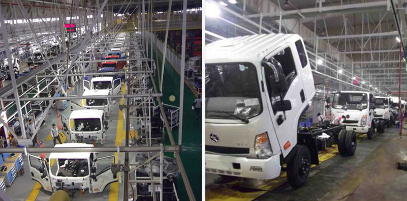本总装生产线用于CGC1047等车型的内饰装配、底盘装配、平板货厢合装、自卸货厢合装等总装工序,同事也包括发动机、后桥等部件的分装,年产6万辆汽车,生产节拍为3.5分/辆,转载处节拍3分/辆。