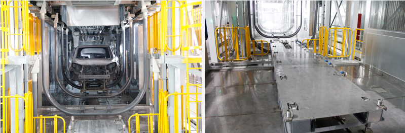 江铃控股涂装摆杆输送线包括:前处理、电泳摆杆及前后出入口滚床等。输送线配置有CS控制系统,实时监控系统、故障报警等功能。